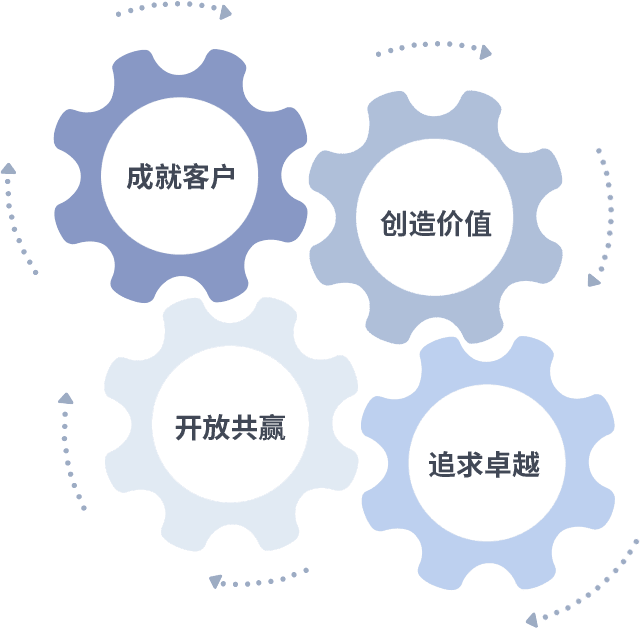 成就客户是一切决策的出发点,,,创造价值是衡量所有工作的标准,,,,追求卓越是我们做事做人的态度,,,开放共赢是我们的格局也是最终的结果。。价值观的齿轮环环相扣,,推动着组织里的每个人不断向前。。。